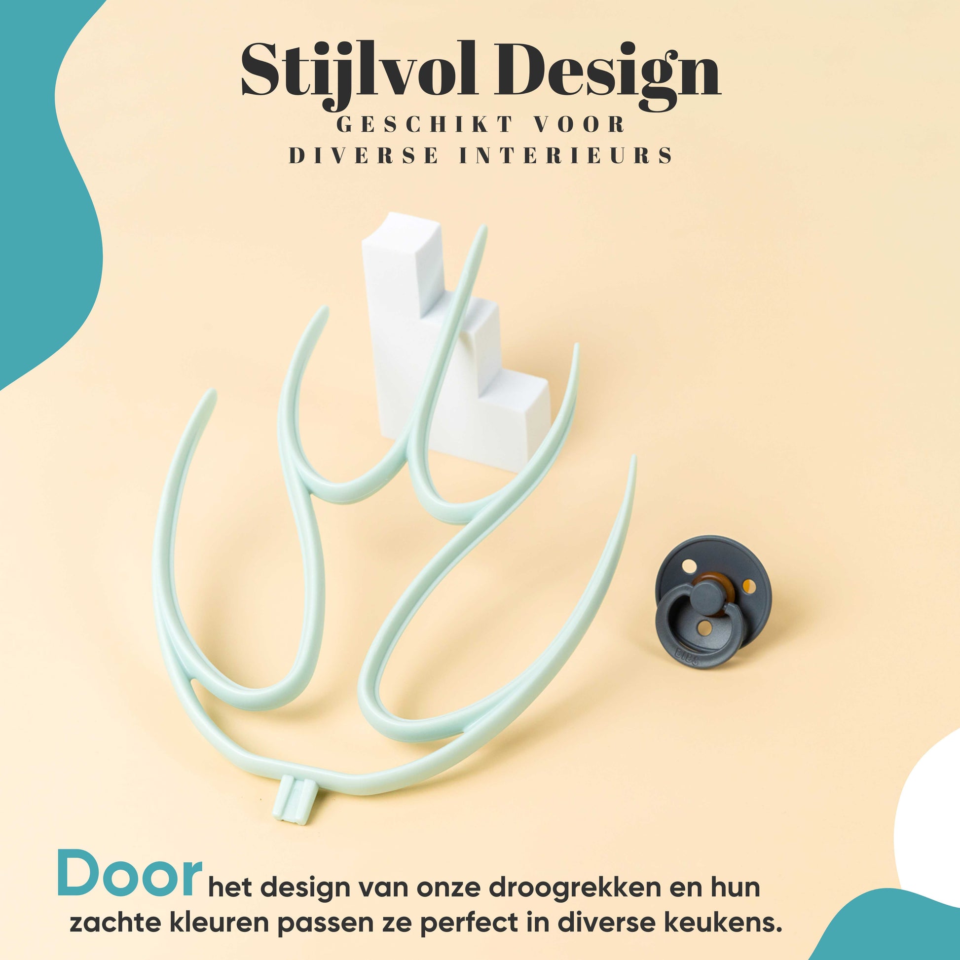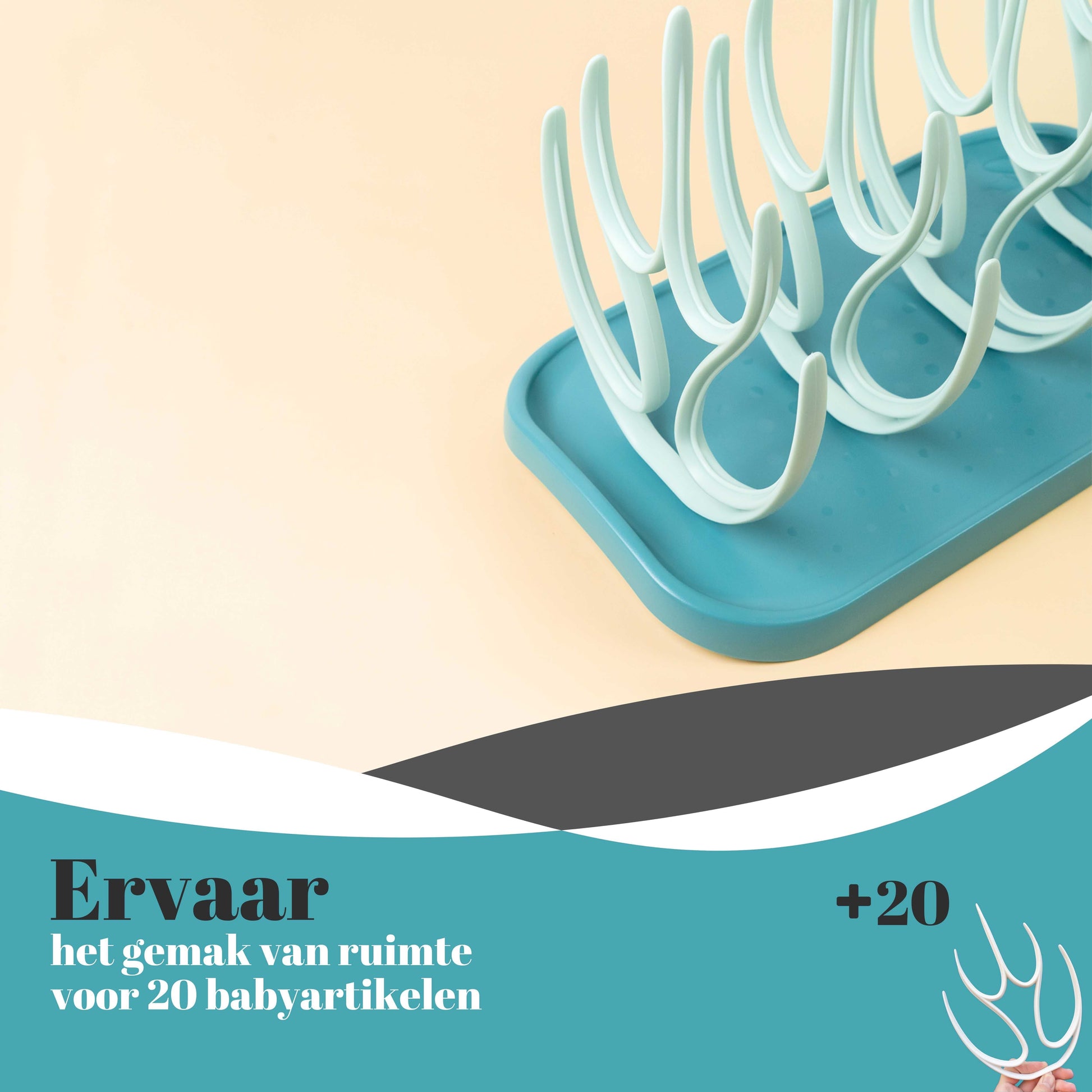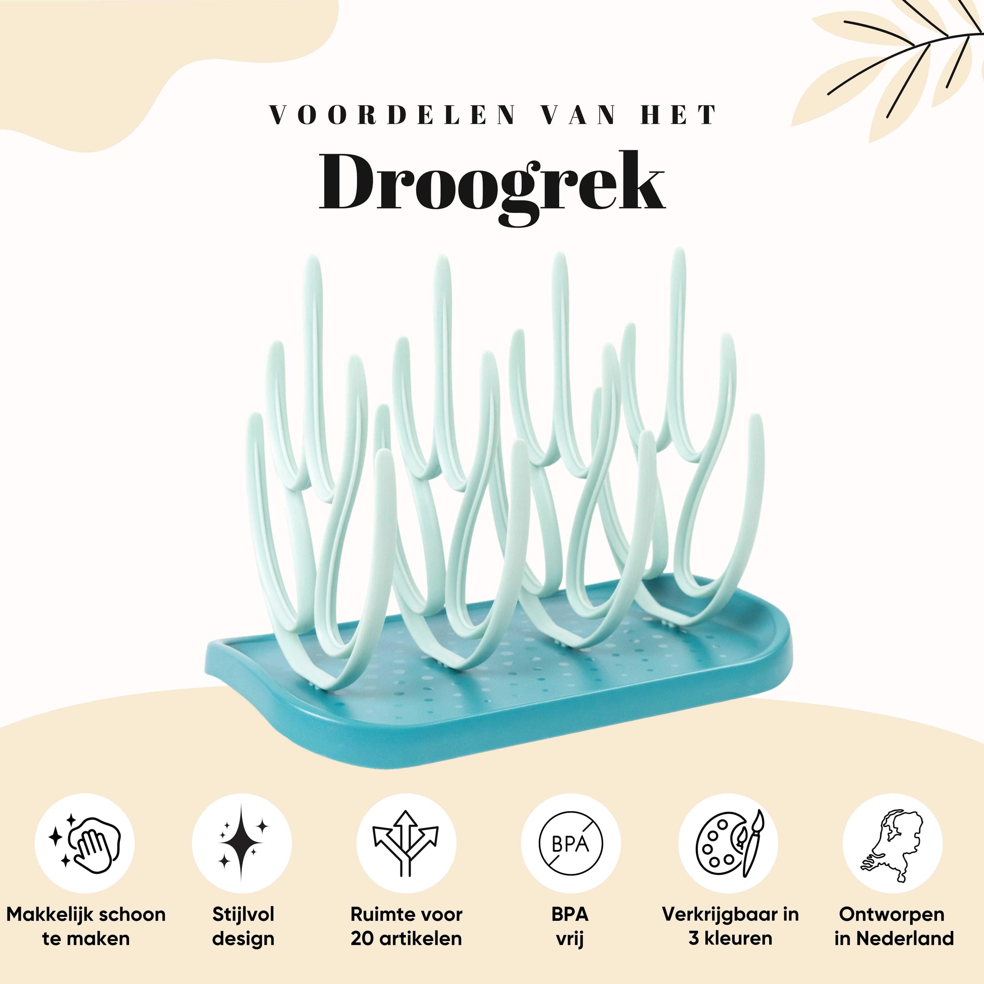 Ons droogrek maakt het leven met een pasgeboren baby even net wat comfortabeler. De zachte kleuren en het moderne design zorgen ervoor dat het flessenrek goed wordt opgenomen in je keuken. Het droogrekje beschikt over veel ruimte zodat je babyflessen, spenen en andere accessoires op een veilige en hygiënische manier kunt laten drogen na het schoonmaken en/of uitkoken. Daarnaast is het droogrek zelf, ook makkelijk schoon te maken met de hand of in de vaatwasser.